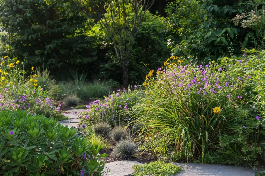 Beyond visual appeal, a layered ecological palette solves practical problems conventional beds ignore. Deep-rooted prairie grasses pierce compacted soils, improving infiltration and easing stormwater pressure around foundations. Flowering understory trees such as redbud and serviceberry cast dappled shade that cools hardscape and protects woodland ephemerals beneath. Massed drifts of native perennials knit into living mulch, suppressing weeds and eliminating herbicide use. Seasonal bloom sequences keep pollinators fed from earliest spring to late frost, while winter seedheads sustain overwintering songbirds. Each plant is chosen for color, texture, and the ecosystem service it provides—nectar, larval host foliage, nesting material, or soil-building biomass. Over time the garden design becomes a self-regulating community that demands fewer inputs and delivers measurable benefits such as carbon sequestration, erosion control, and urban-heat reduction.