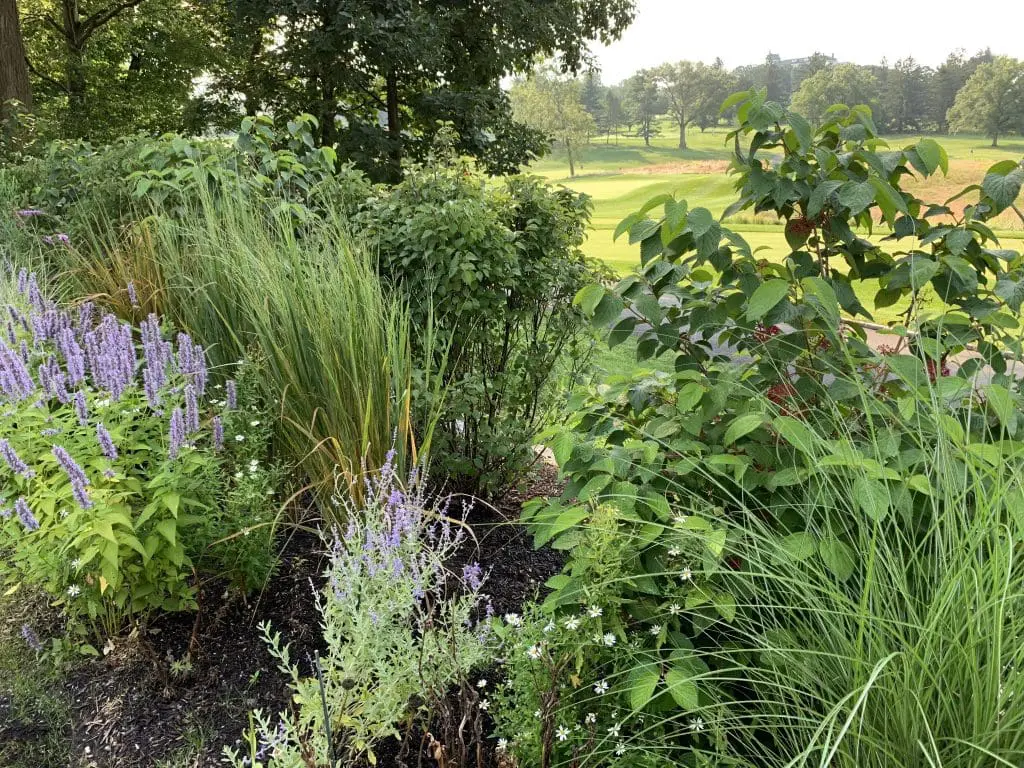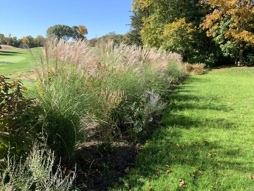 The rear terrace was to be planted with assorted viburnum shrubs – the dense, deciduous shrubs would provide necessary screening during golf season, and open up the expansive views in the winter. The second, front terrace was to be planted with ornamental grasses and pollinator-attracting perennials.