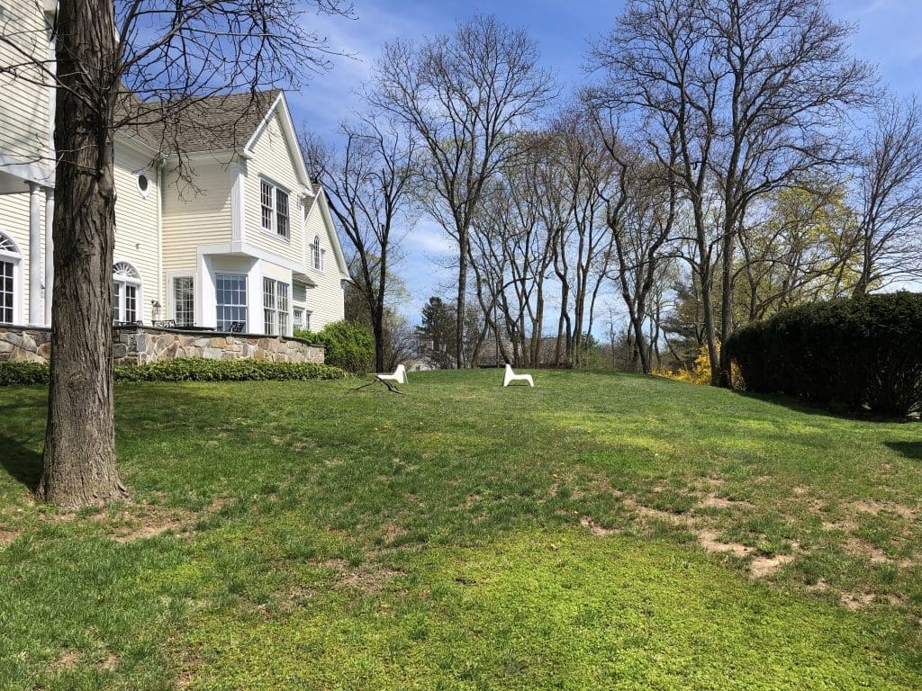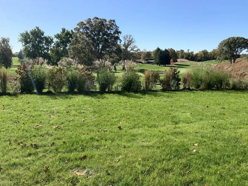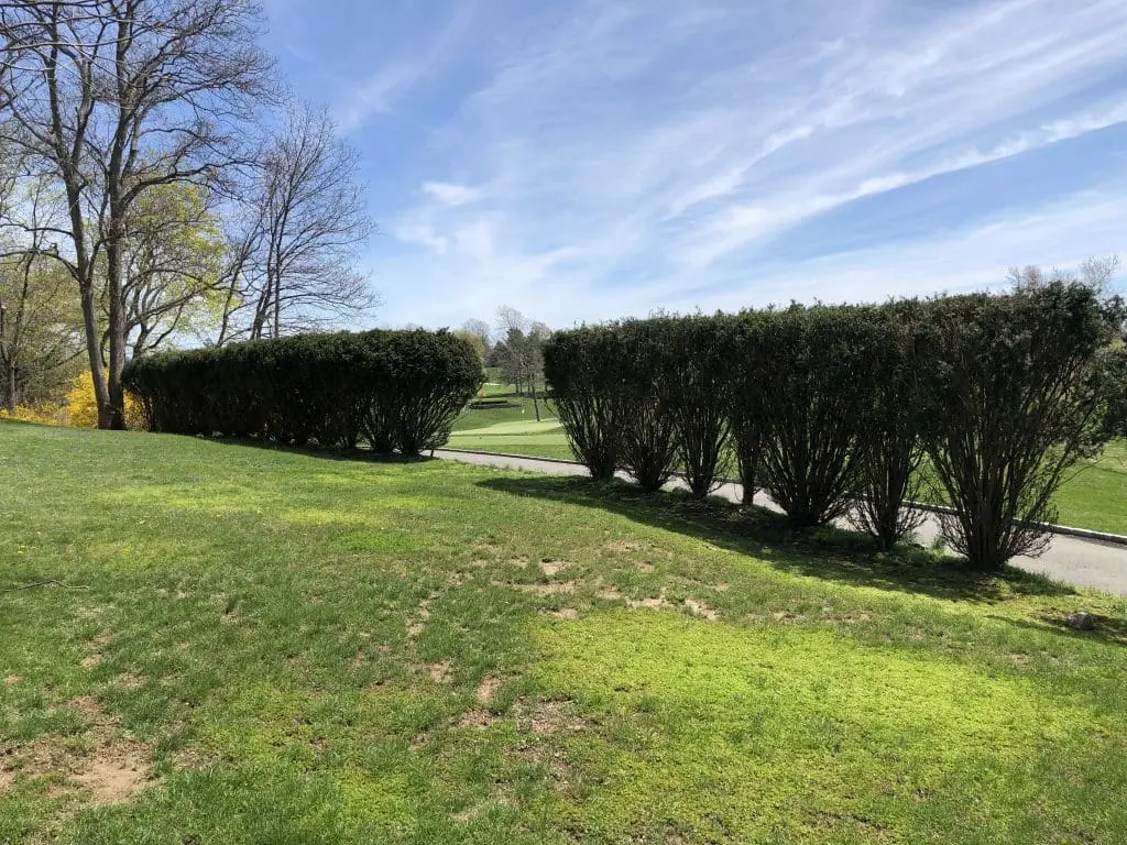 The client has a young family and the main reason they booked a consultation with us was because their yard, at a significant slope, created a pesky and somewhat dysfunctional play area for their children. Playing ball almost certainly lead to loss of the ball to the slope, and likely across the path into the golf course that abuts the backyard. What’s more, the row of yews that lined the southern edge of the property had grown so that the dense part of the shrub blocked the rolling green hills and skyline, while the yews’ thin trunks revealed the road behind and golfers’ legs in a most frustrating way. To top it off, the previous owner, apparently a golf fan, had left a ten-foot gap in the center of the yews, so that he could watch the golfers tee off! From the back patio!