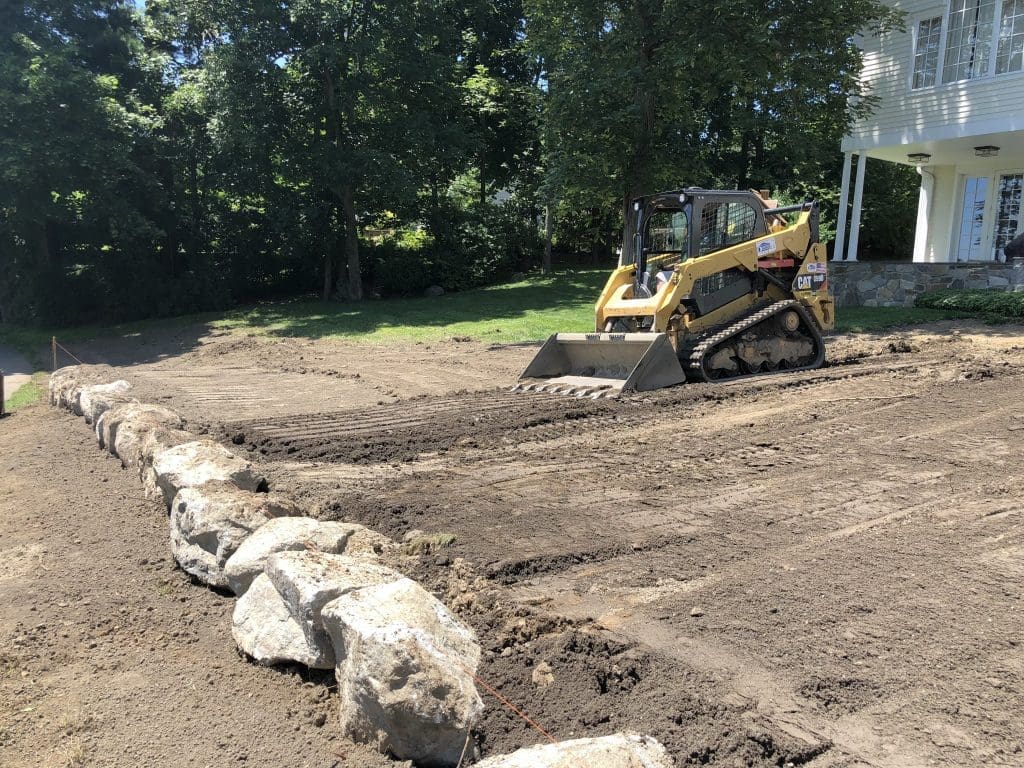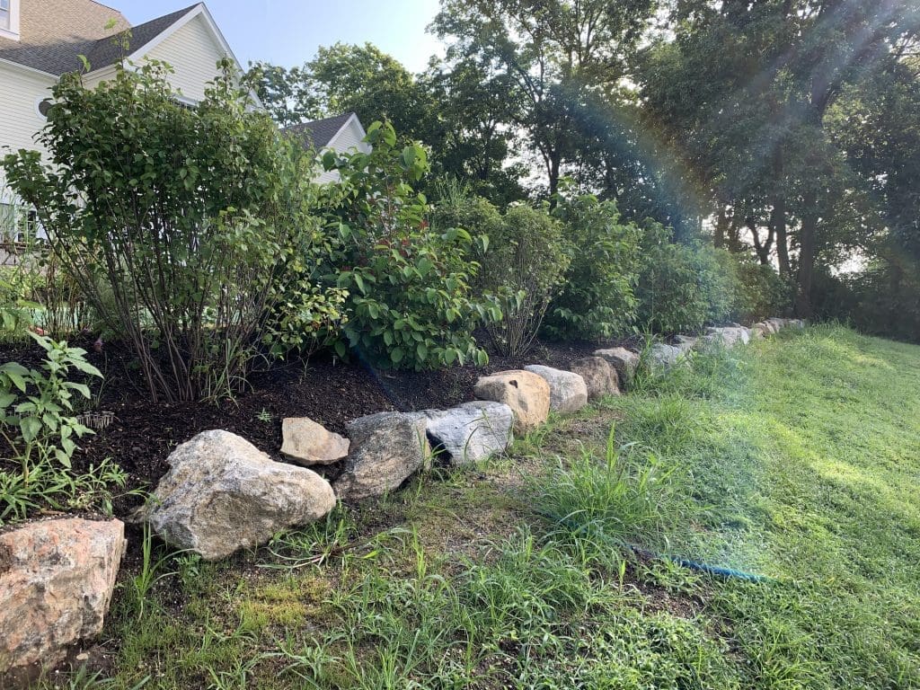 To solve the slope issue, without completely blowing the client’s budget, we proposed a rip-rap retaining wall constructed of large boulders that supported a two-tier, terraced planting bed that effectively lifted the overall grade of the backyard around three feet. We brought in premium topsoil by the truckload, and graded with a machine and by hand.