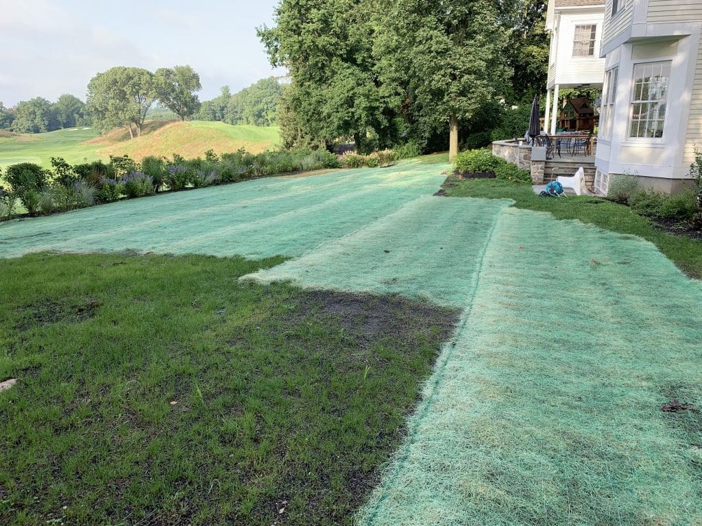 The organic lawn installation required installing hay blankets on top of the seed for stabilization during the germination phase. This installation took place in July, and a series of intense rain events demanded that we take extra precautions with the bare soil.