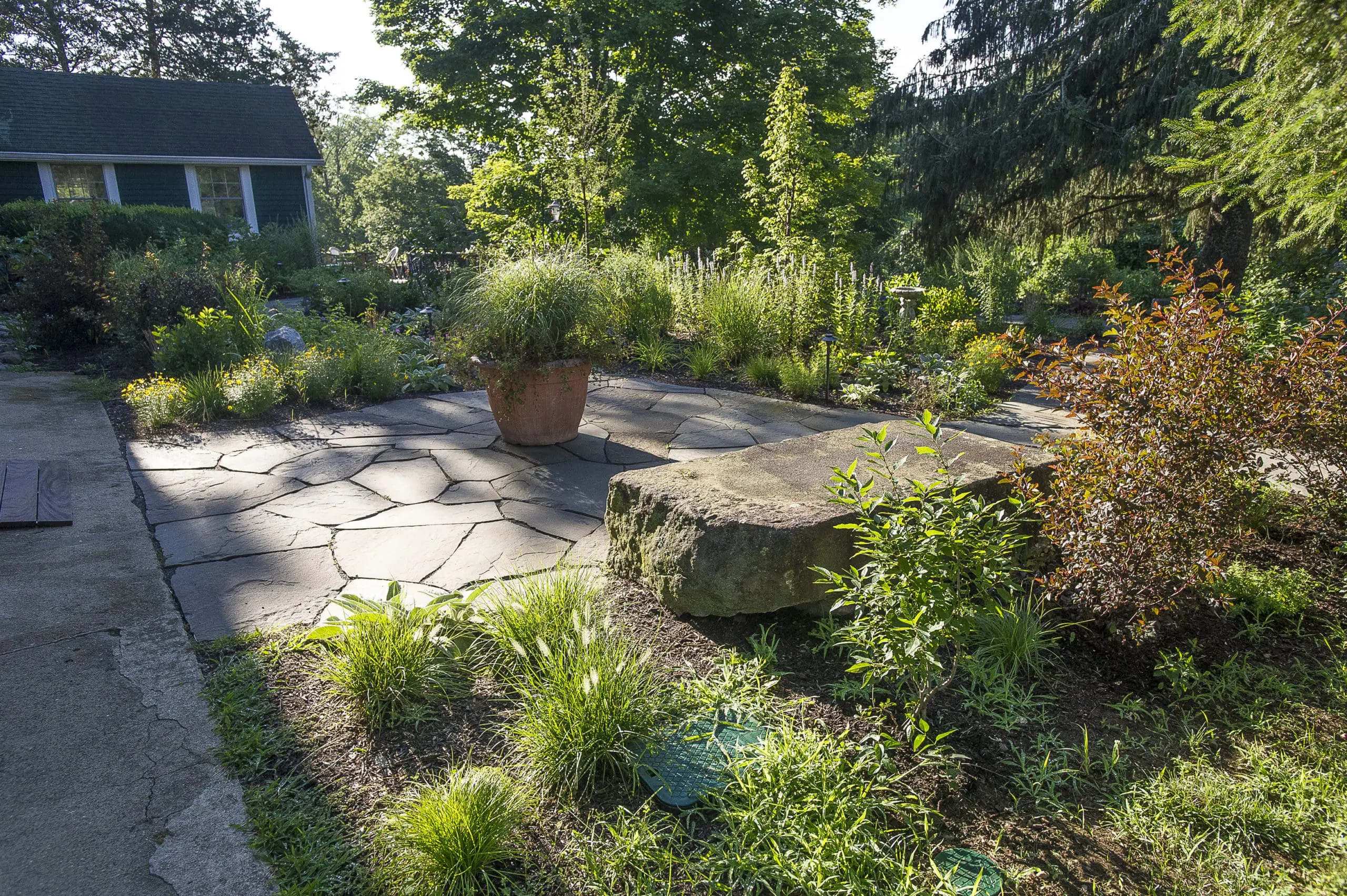 The inspiration for this backyard renovation was the mature trees that encircle the space, lending a sense of enclosure and intimacy. GJLD designed a courtyard garden featuring a natural stone patio off the house for dinning, entertaining, and relaxing, and several stone paths that meander through the garden. Benches are strategically placed throughout the garden for unique viewpoints of the landscape.