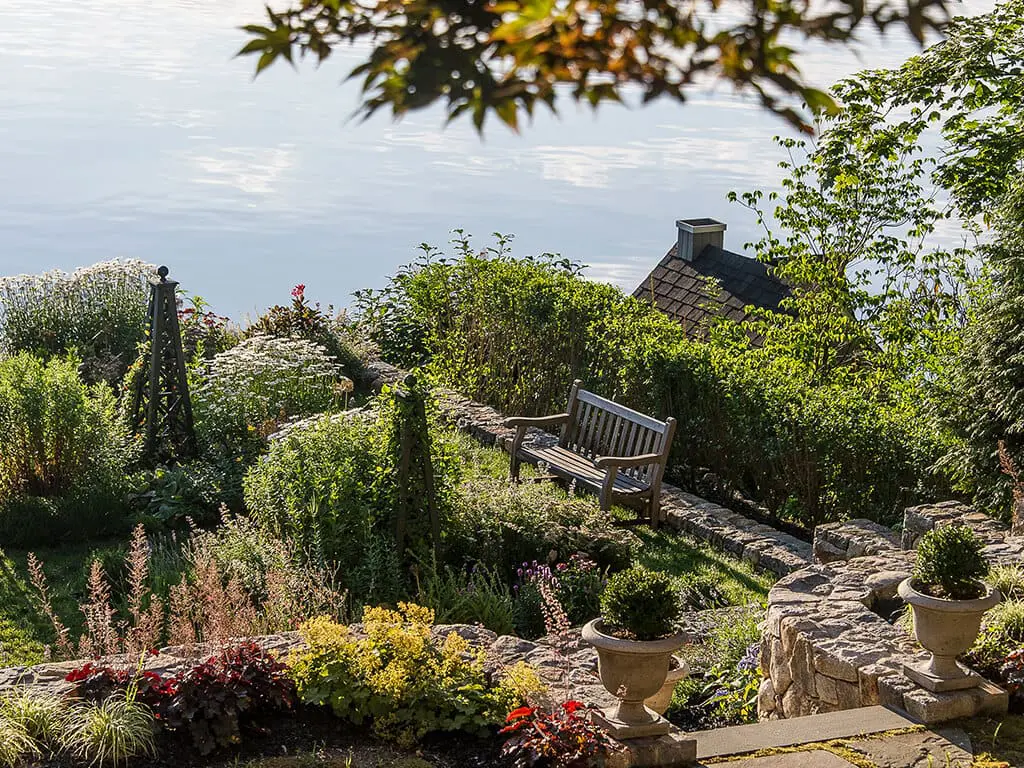 We designed a planting that was less rigidly symmetrical as the traditional style but used repetition to connect the individual parterre gardens. The upper terraces received new natural stone walkways and a patchwork of shade-loving ground covers.