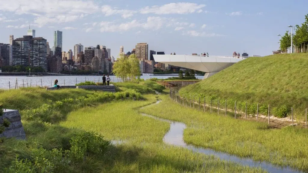 Landscape Architects Michael Van Valkenburgh developed the Master Plan for the site in 2004, which included repurposing six industrial piers into distinct gathering areas, habitats and functional spaces, which were installed from 2010 to 2018, with more future piers on the way. In a decade, this project has become a model for sustainable, ecological landscaping.