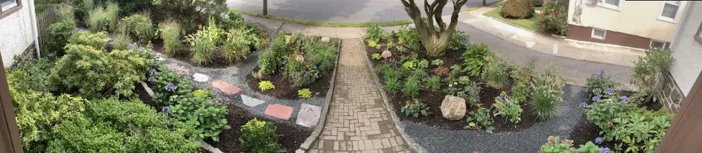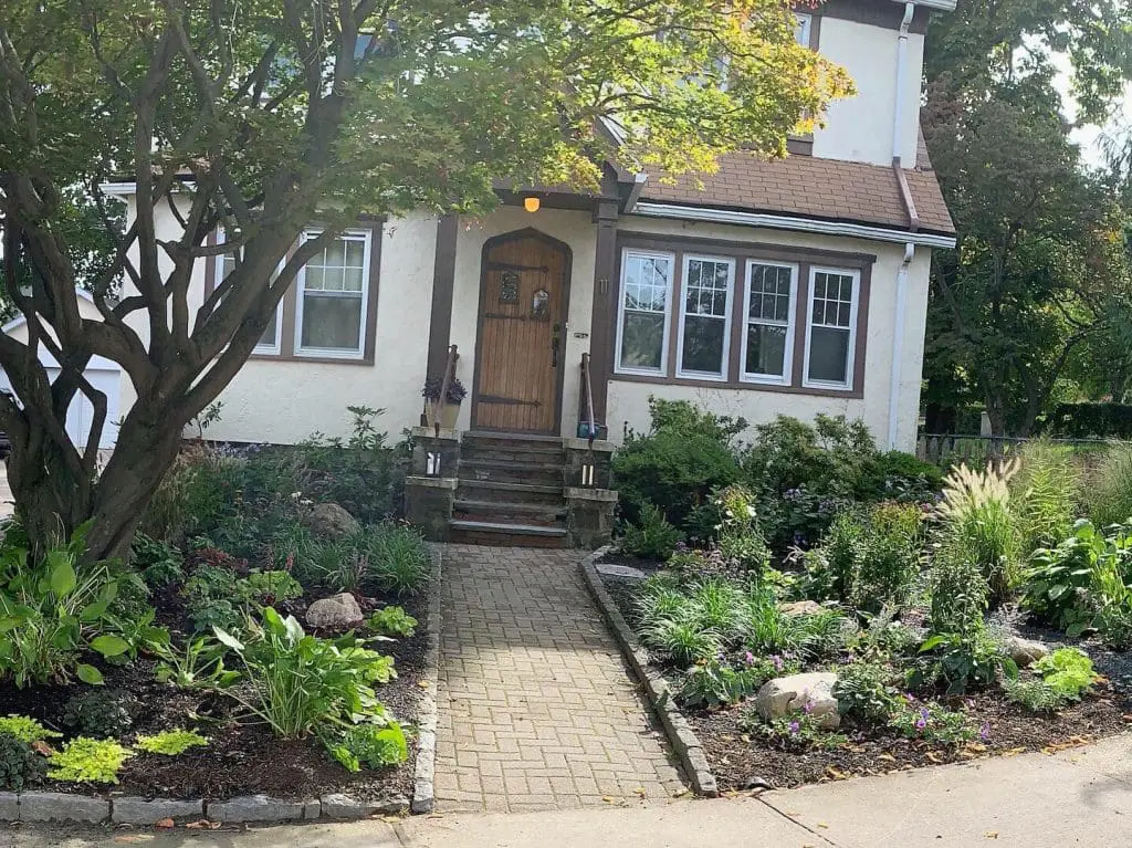 We incorporated boulders throughout and created a meandering gravel and flagstone walkway way that allows you to enjoy both sides of the garden, and cross from the driveway to the rear yard. The backyard was renovated to include a no-mow, eco-friendly lawn.