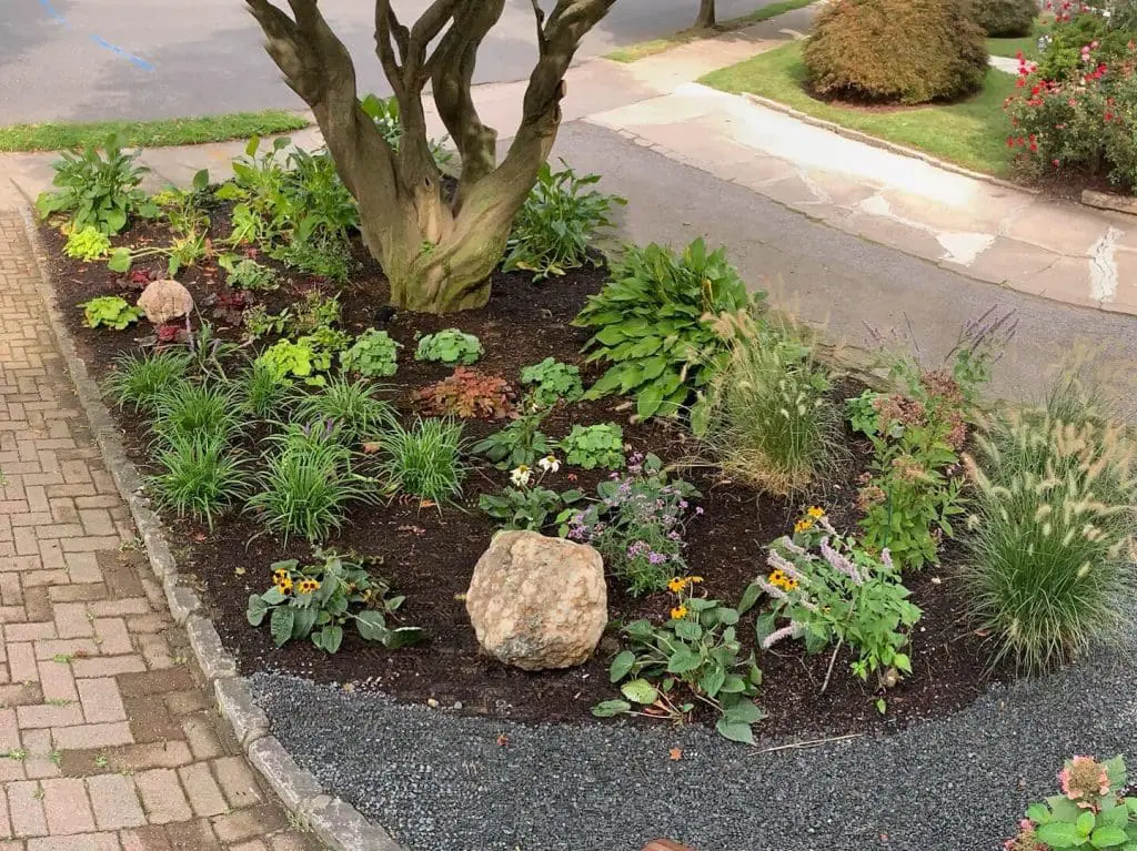 We chose Hydrangea and ornamental grasses as easy-low maintenance plant choices with high flower impact and delicate movement, respectively. Spreading ground covers will also help alleviate weed pressure and fill in attractively over the brown mulch.