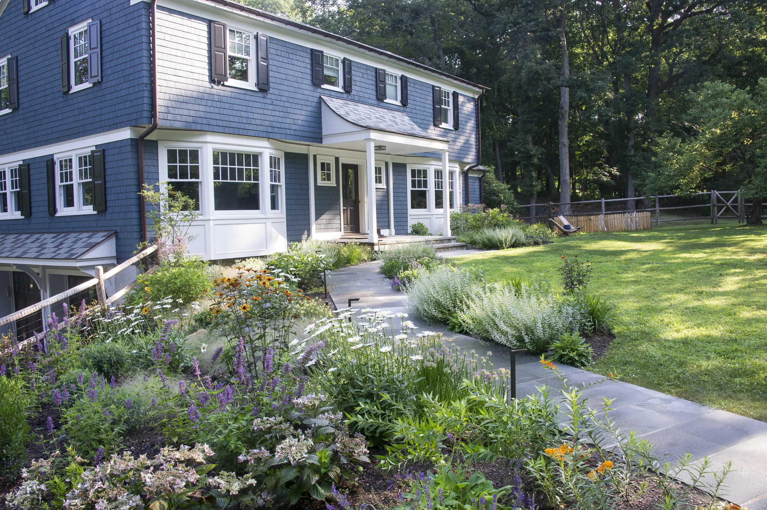 The existing site has mature trees about thirty feet from the home, creating a feeling of enclosure and intimacy that evokes a cloister garden. As always, we opted for a predominantly native plant palette to support the local ecology. Since this is a therapy garden, we also included high sensory plants: fragrant, varied textures, colorful throughout the year. Ornamental grasses create movement in the landscape and velvety plants like lambs’ ear along the border beg to be touched. Therapy gardens are about stimulating the senses, creating meditative spaces and inspiring a reconnection with nature. Our clients love to observe the pollinators and songbirds that visit the garden from season to season.