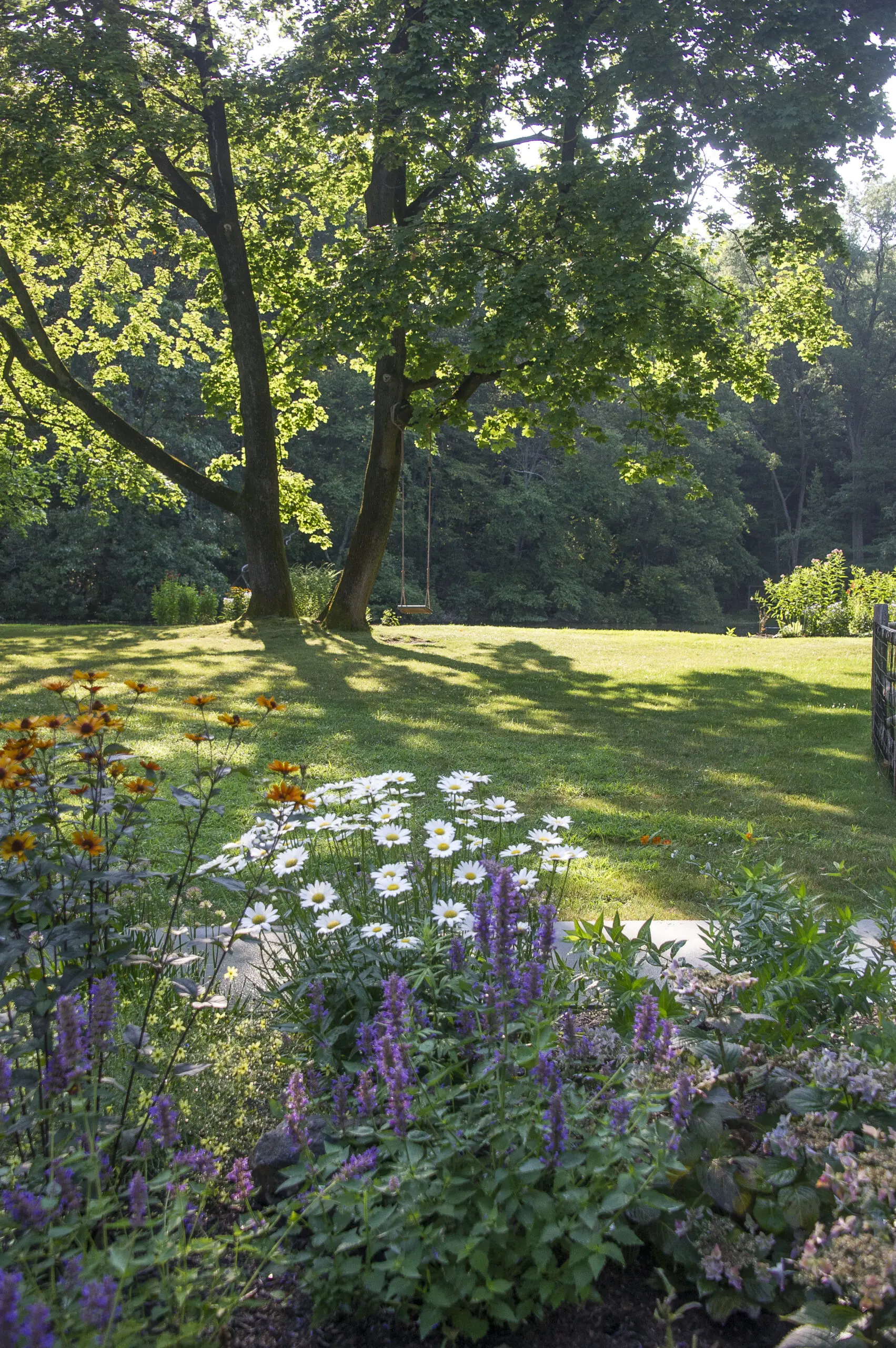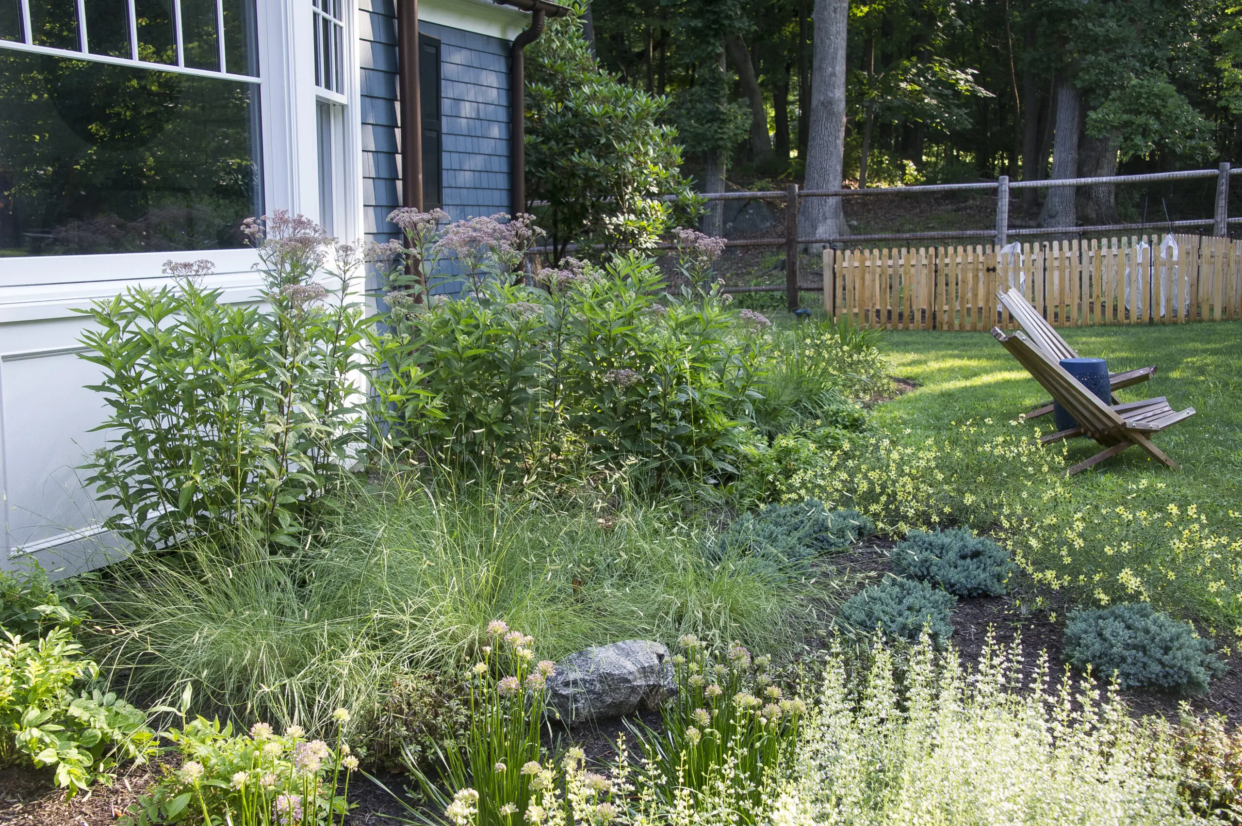 Most of the planting design is around the front entrance and driveway, where light conditions range from part shade in the driveway to full sun by the house. To update the landscape, we designed a matrix inspired planting featuring an abundance of native grasses and low-growing shrubs. We added three pocket planting beds along the right side of the existing front walkway to balance out the large existing bed on the left side of the walk. A mix of Purple Love Grass, Threadleaf Coreopsis and Allium created an airy, ethereal feeling while slightly taller perennials punctuate through the matrix to create colorful vignettes. We made sure to keep the overall planting height low to preserve the architectural views of the home and the view of the pond from inside the house.