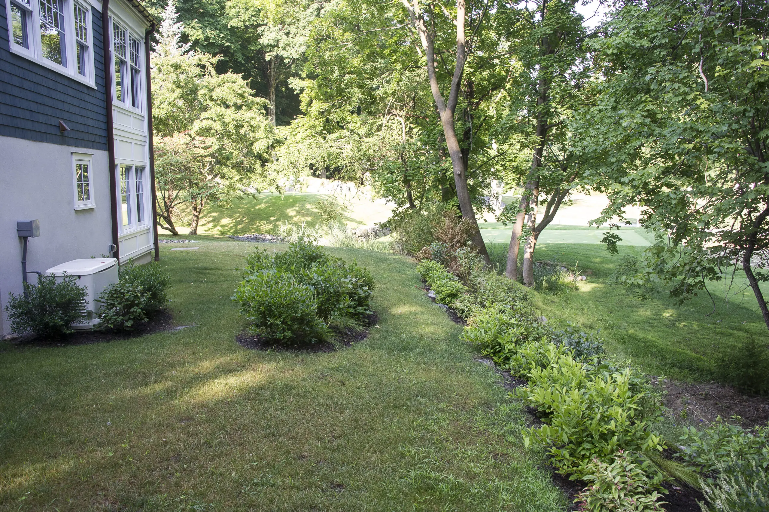 In the backyard, a level lawn area transitions to a steep slope that drops off to hole at a golf course. There were existing mature trees along the property border, but no understory planting to screen the golfers. We planted the slope with native woodland shrubs and seeded the lower slope with a conservation mix, both of which will stabilize the soil and prevent erosion.
