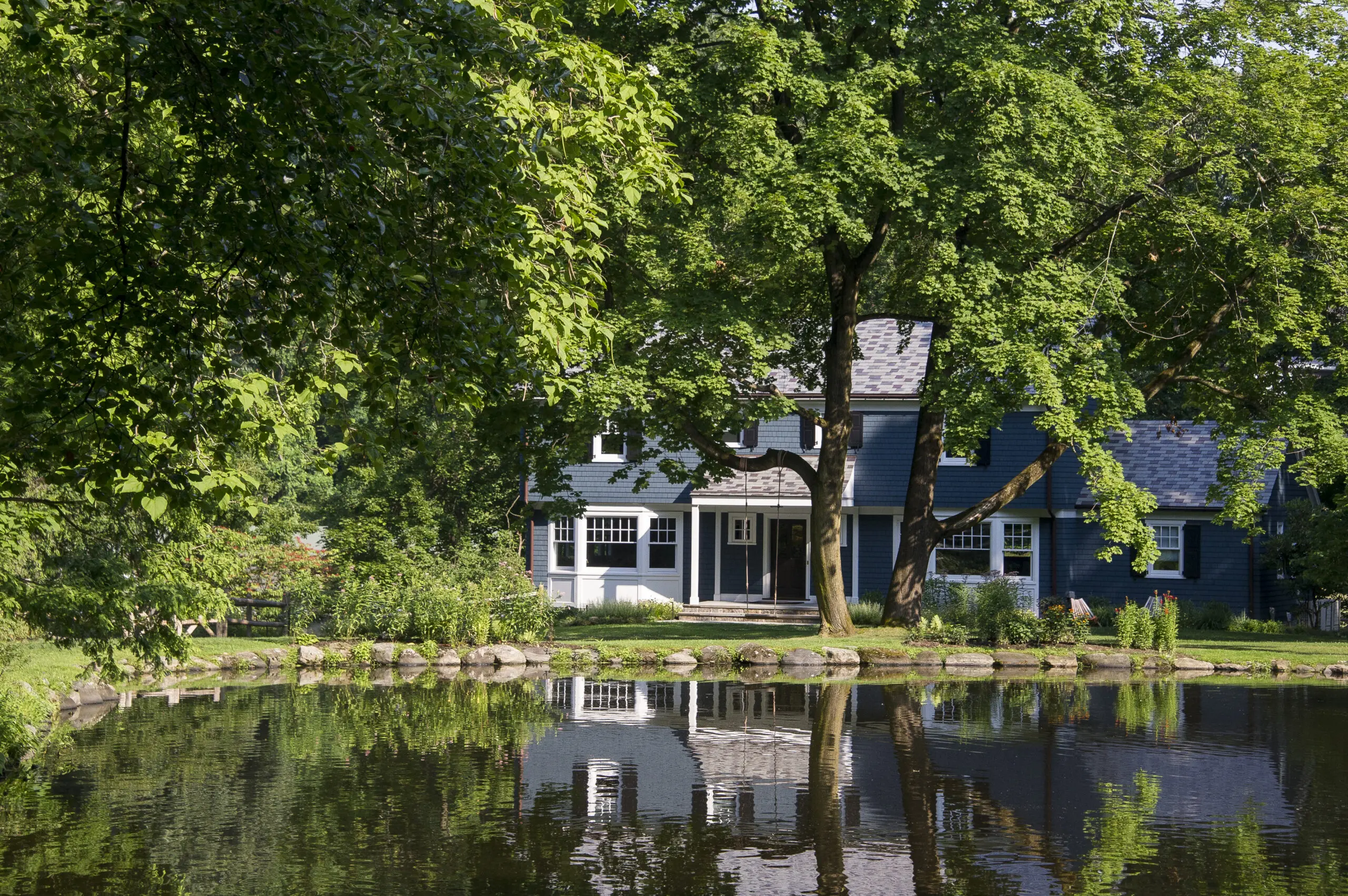 Around the pond, we deployed several tactics to preserve water quality. Three pocket gardens along the closest side of the pond were planted with native wetland plants (Cinnamon Fern, Milkweed, Red Cardinal Flower, among others) that will intercept runoff from the lawn and prevent nutrient loading in the pond. Along one side of the pond, where the topography outside the property slopes up, directing stormwater to the lake, we installed underground piping to funnel the water without eroding the pond bank.