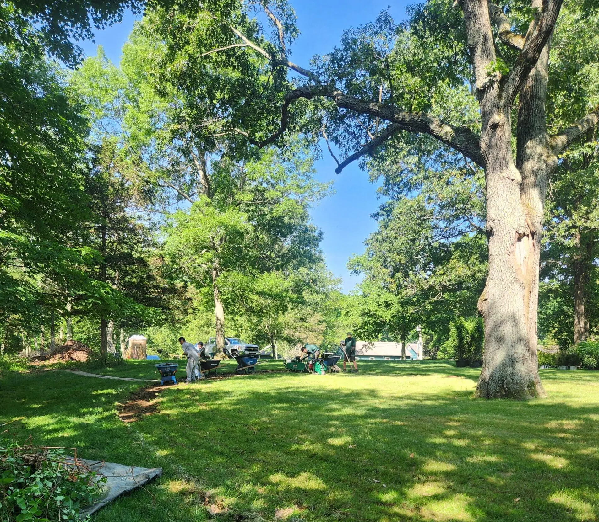 When we arrived on site for the consultation, the client had already staked out his desired landscape area. It centered around a massive custom gazebo in the lawn, with four amorphous quadrants extending from it, leaving space for four mowed paths dissecting them. A mature oak in one quadrant also had an existing swing hanging from its branch, that swung perfectly through one of the mowed paths – well thought out!