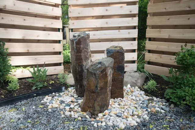 The free standing shadow box lattice panels we designed with a canted tilt act as a screen for the compost pile and utilities behind and a bright backdrop in the shady corner of the backyard. The natural stone, granite bubblers or pillars serve multiple functions. They give depth and strength to the design theme of the Earth’s basic elements of stone, water and wood, soil and plants, they also do a great job attracting birds, who enjoy bathing in the water. The electric service for the pump is concealed and controlled from a switch inside the house.