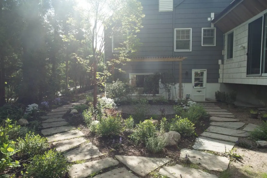 In addition to the wonderful ecological benefits which the predominately native plant landscaping provided in attracting a diverse variety of birds, butterflies etc., the composition is intended to produce a gestalt of peace and physical health by connecting the garden of nature with the newly renovated homes architectural success in inviting the outdoors in.