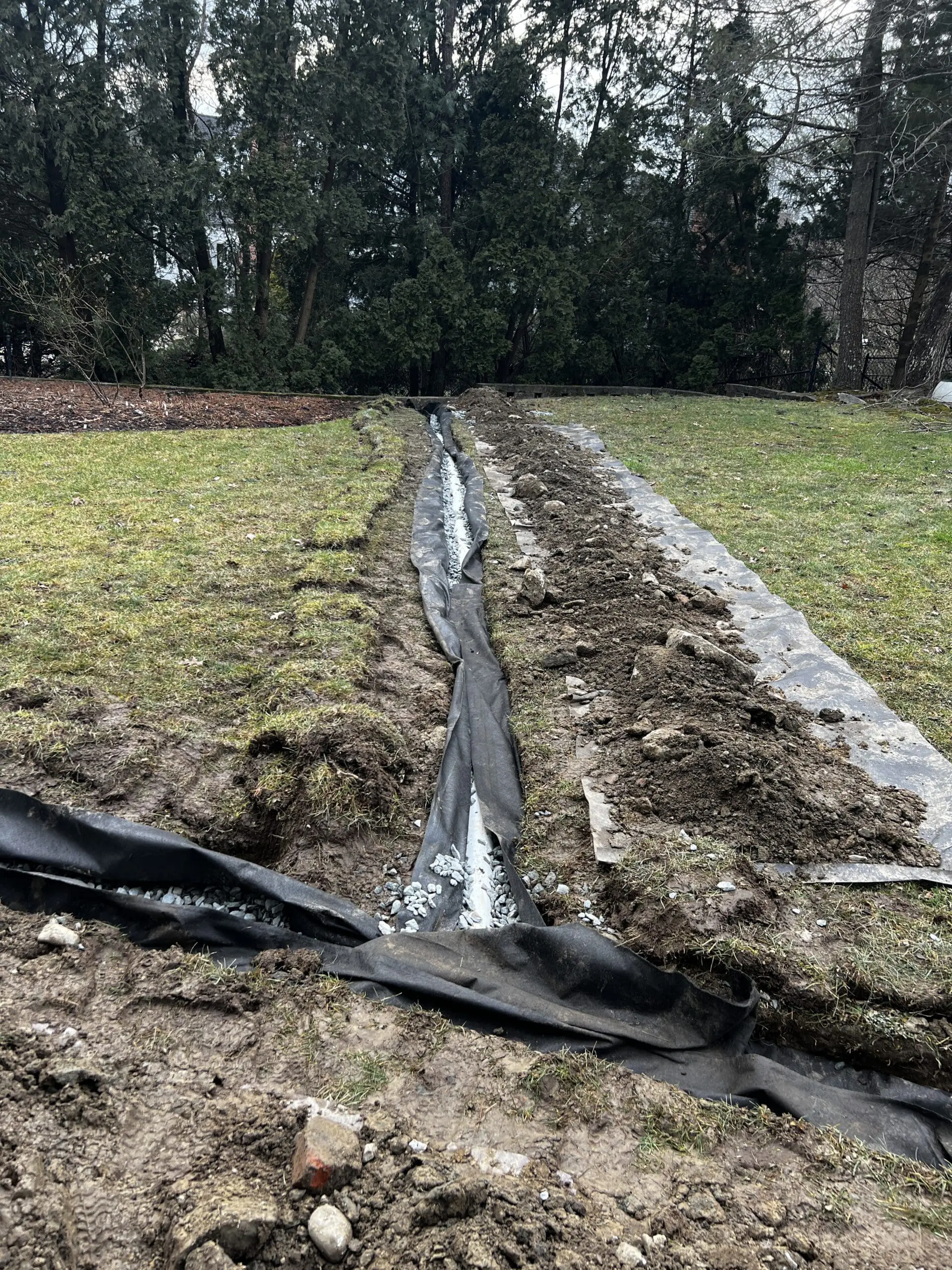 Trench drain installation across a lawn area. - Perimeter Drains, French Drains, Curtain Drains: Perforated PVC pipe surrounded by washed gravel and geotextile fabric, invites the water in from the surface and allows it to infiltrate into the ground. Allows surface water or water from leaders to be captured and directed.