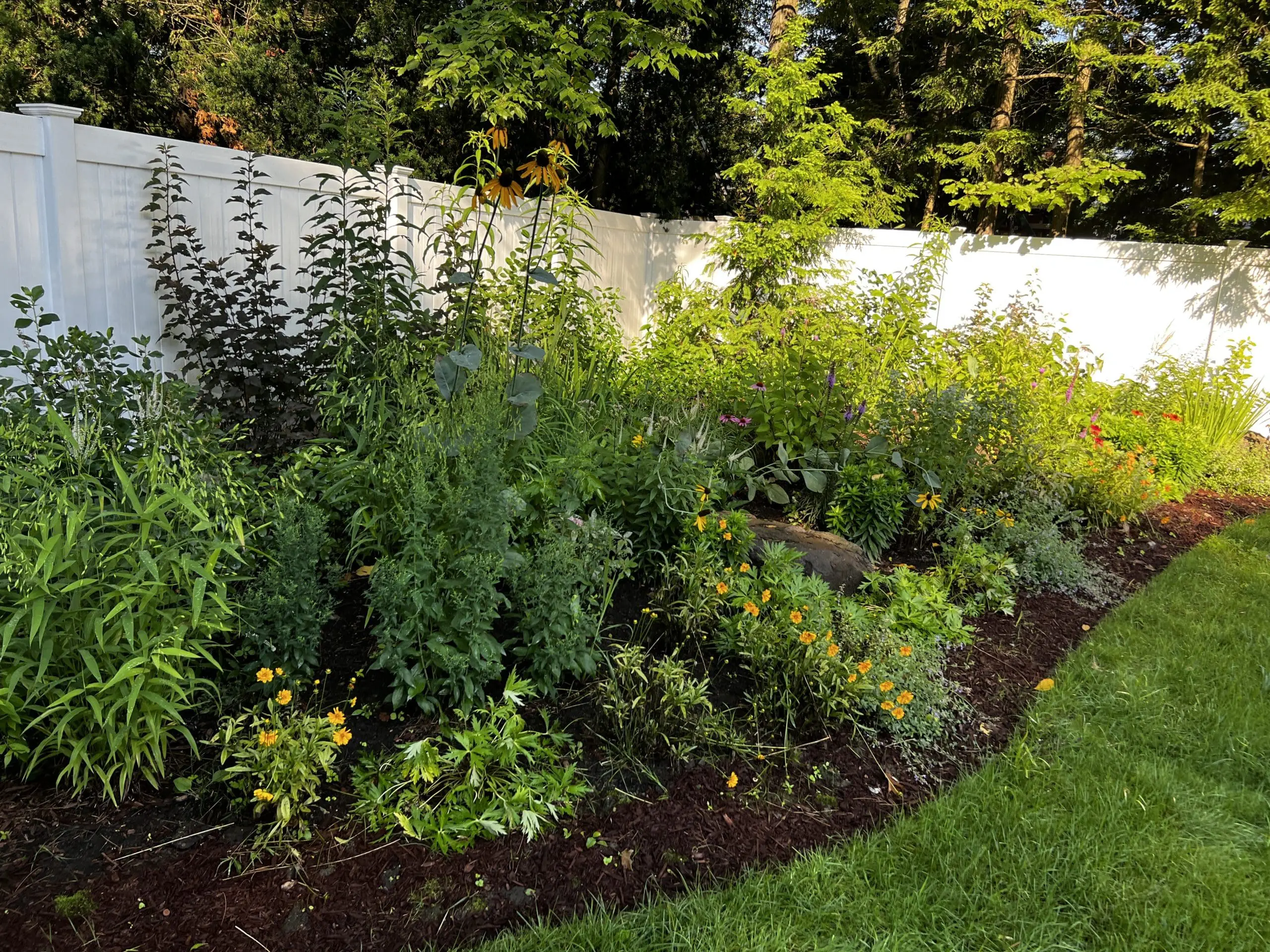 To redirect stormwater away from the house and lawn, we connected two leaders from the roof into underground pipes. We directed the pipes toward the corner of the yard into the newly designed rain garden.