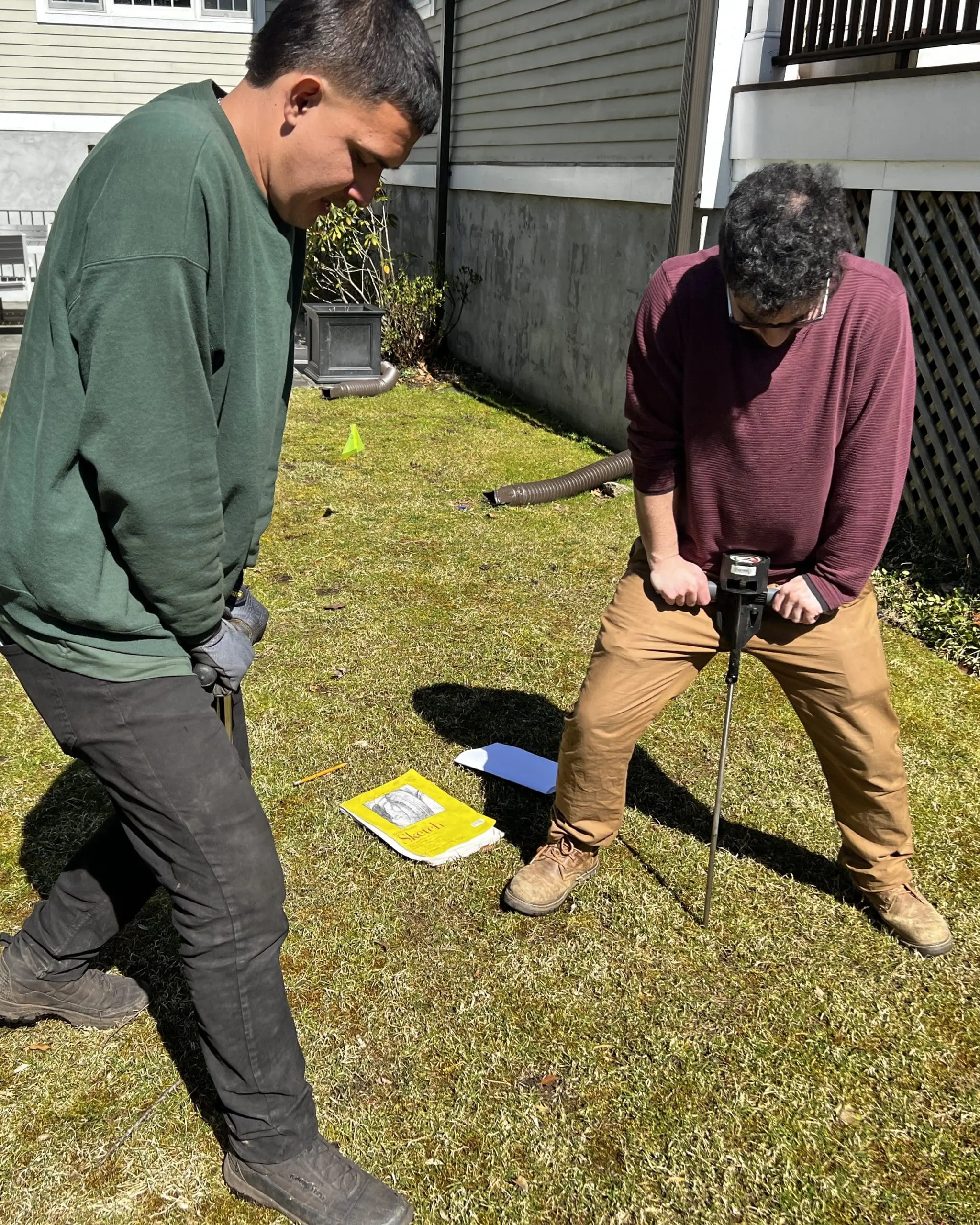 We always perform percolation tests to test the soil characteristics, as part of our site analysis for a rain garden. In the photo above, Uziel tests the soil’s compaction level.
