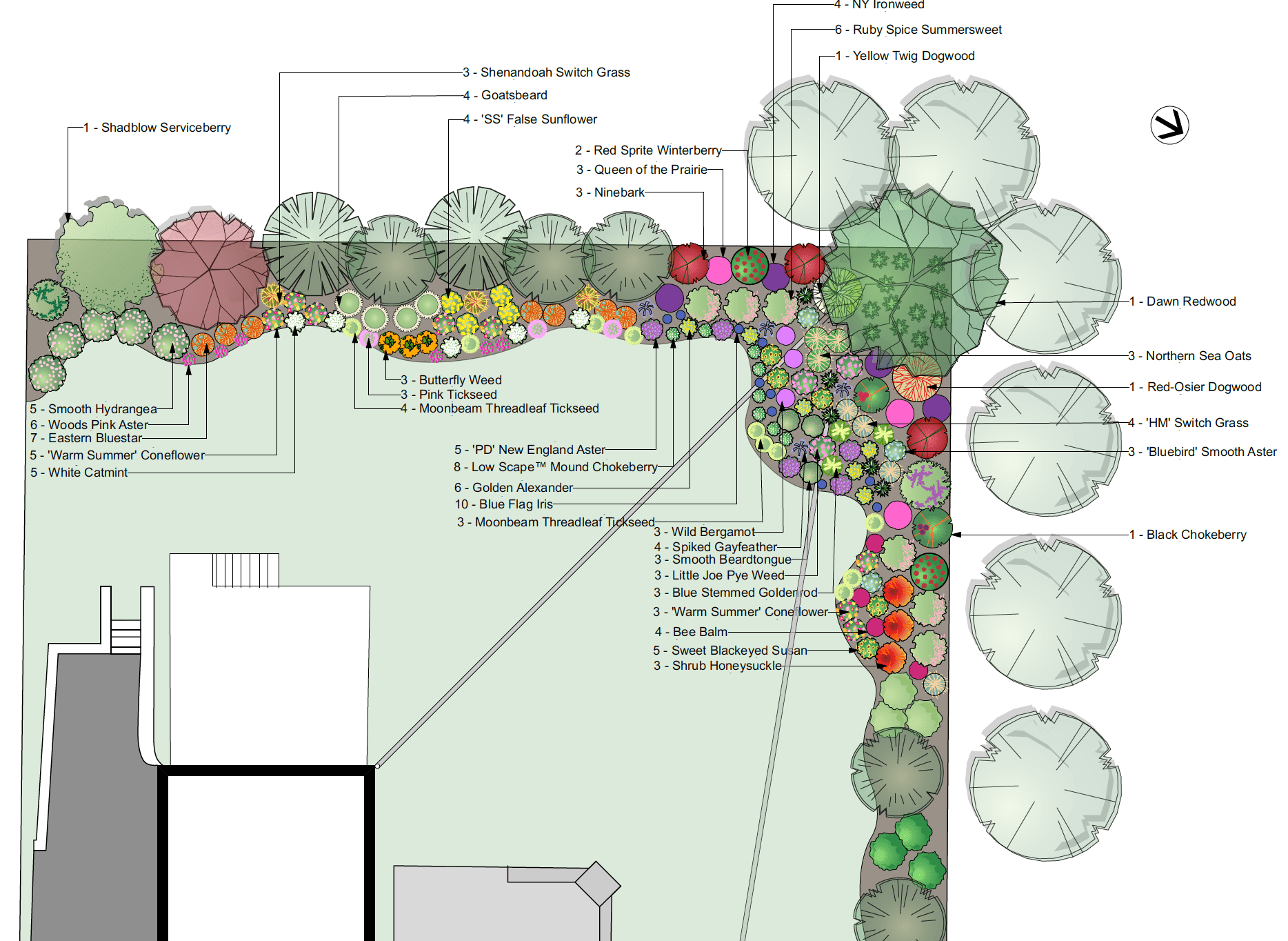 In this design, we also planted a non-native Dawn Redwood. This fast-growing tree absorbs large amounts of water and grows fast; it will be extremely effective in this context.