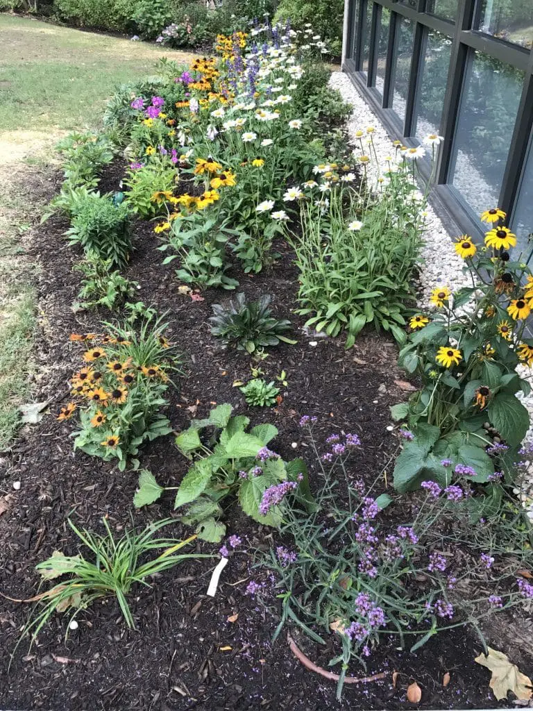 To ensure successful sustainability, low maintenance and what we refer to as enduring longevity, we incorporated aggressive ground covers as green mulch to gradually replace the need to re-mulch year after year (where appropriate), introduced selected long-blooming perennials to attract pollinators and employed river rock and gravel mulch in a splash pad/apron surrounding the gutter/leaderless structure.