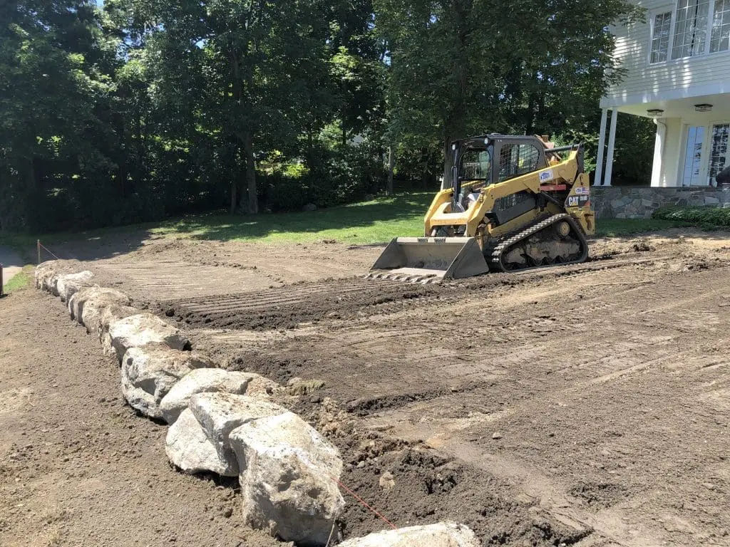 A common request from clients with young families is create a level area for outdoor play.  In this case, the property had an ample backyard lawn, but the slight slope made playing ball impractical for their children, especially since the property borders a golf course. For this Harrison, NY backyard landscape design, we brought in many yards of engineered soil and graded the lawn area into a level play area.