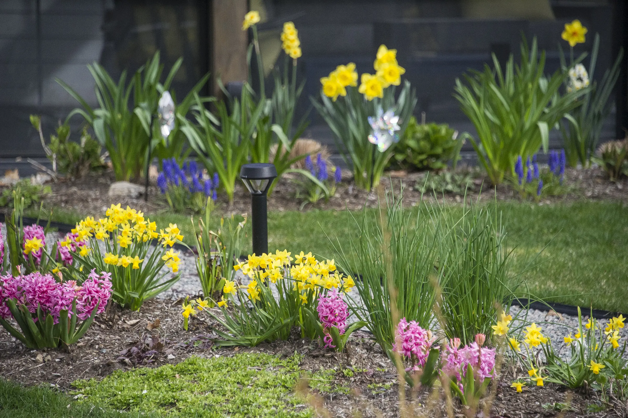 In late fall, as our landscapes fade to shades of gold and tan, spring may be the furthest thing from your mind. This is your reminder to shake that feeing and plan for spring – the time for planting spring flowering bulbs is upon us! Bulbs are a unique category of plants that require cold stratification from freezing temperatures to flower appropriately in spring. When planted in late fall, their roots still have some time to develop and become established before winter. At GJLD, we sequence bulb species and cultivars to maximize early spring blooms, from late February, through march and into April. Daffodils are a favorite since their toxicity prevents deer, rabbits and other wildlife from eating them, and they don’t require full sun. Hyacinths and alliums are other tried and true favorites. For our urban dwellers or those prepared to be vigilant with their animal repellent applications, tulips are pure joy machines.