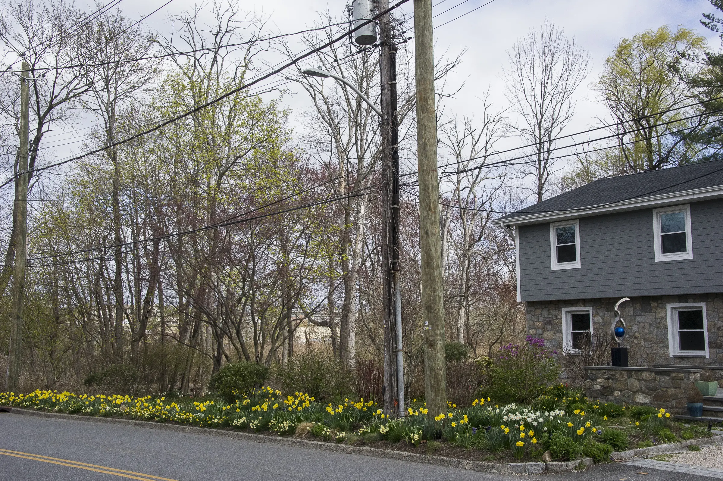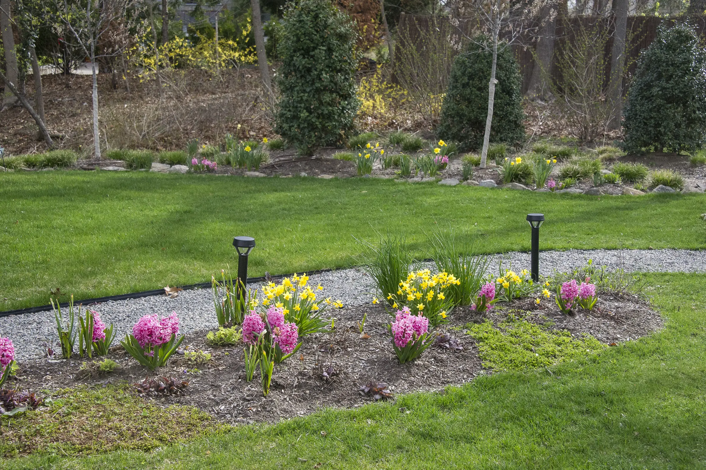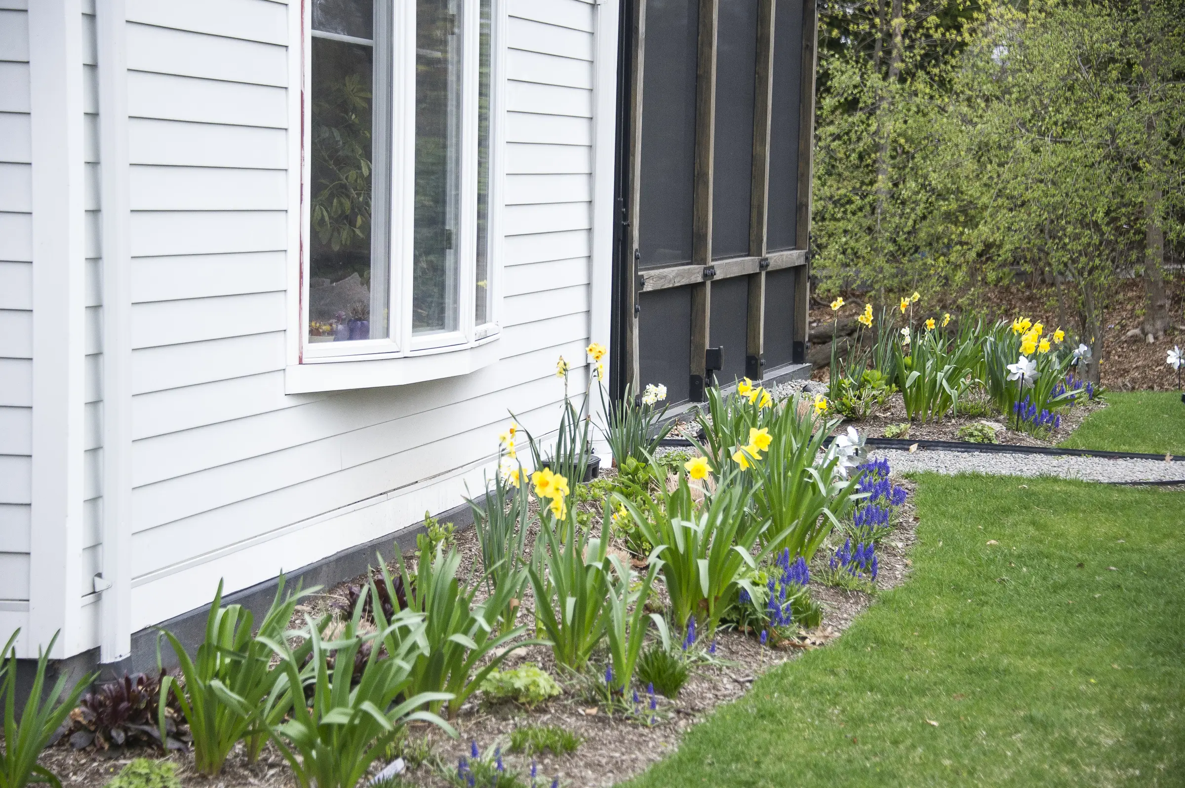 Spring flowering bulbs add early season color to a foundation bed in Westchester, NY.