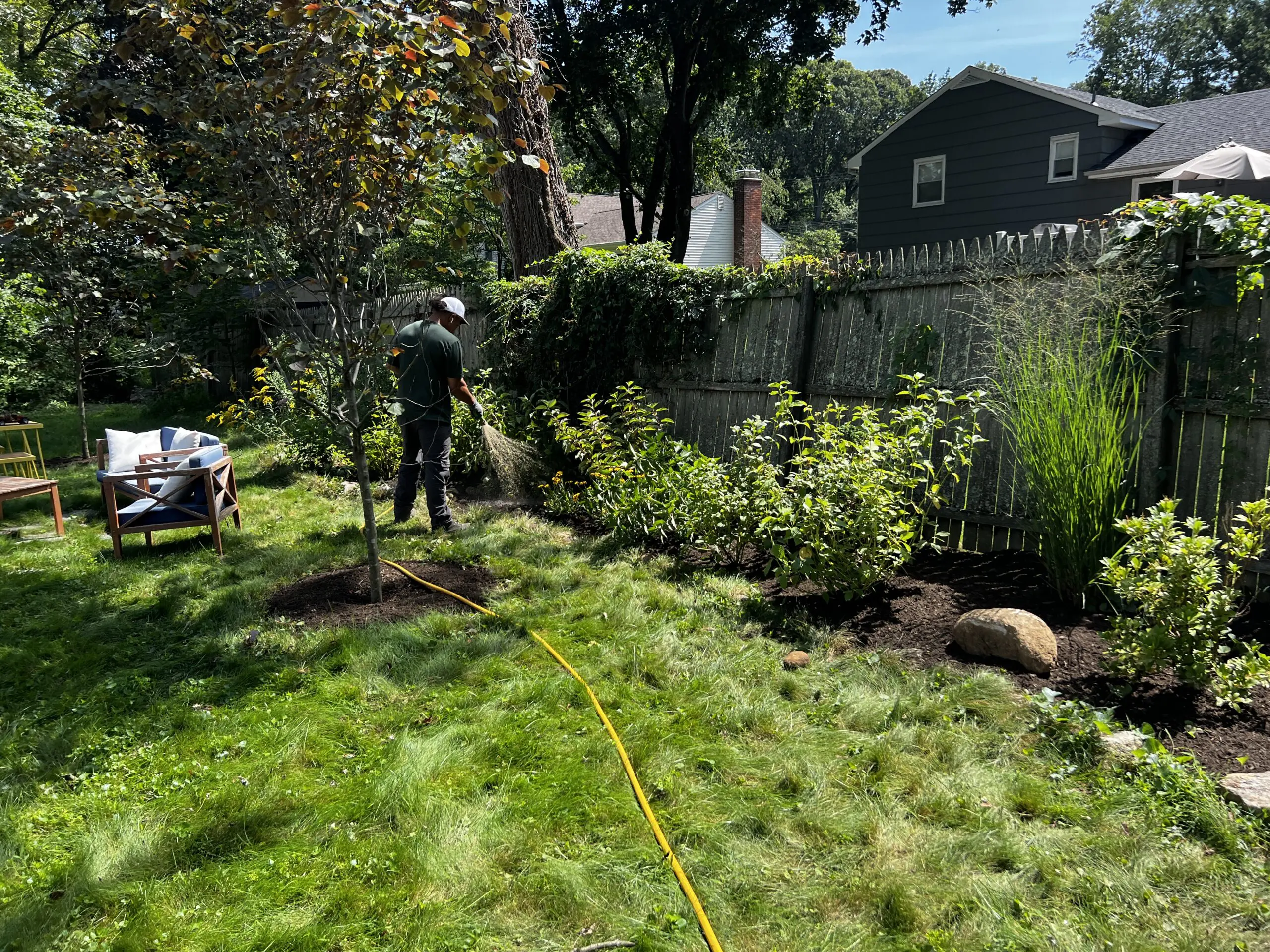 GJLD crew member soil drenches a new planting with microbe inoculants and wetting agents to reduce planting shock during hot summer months.